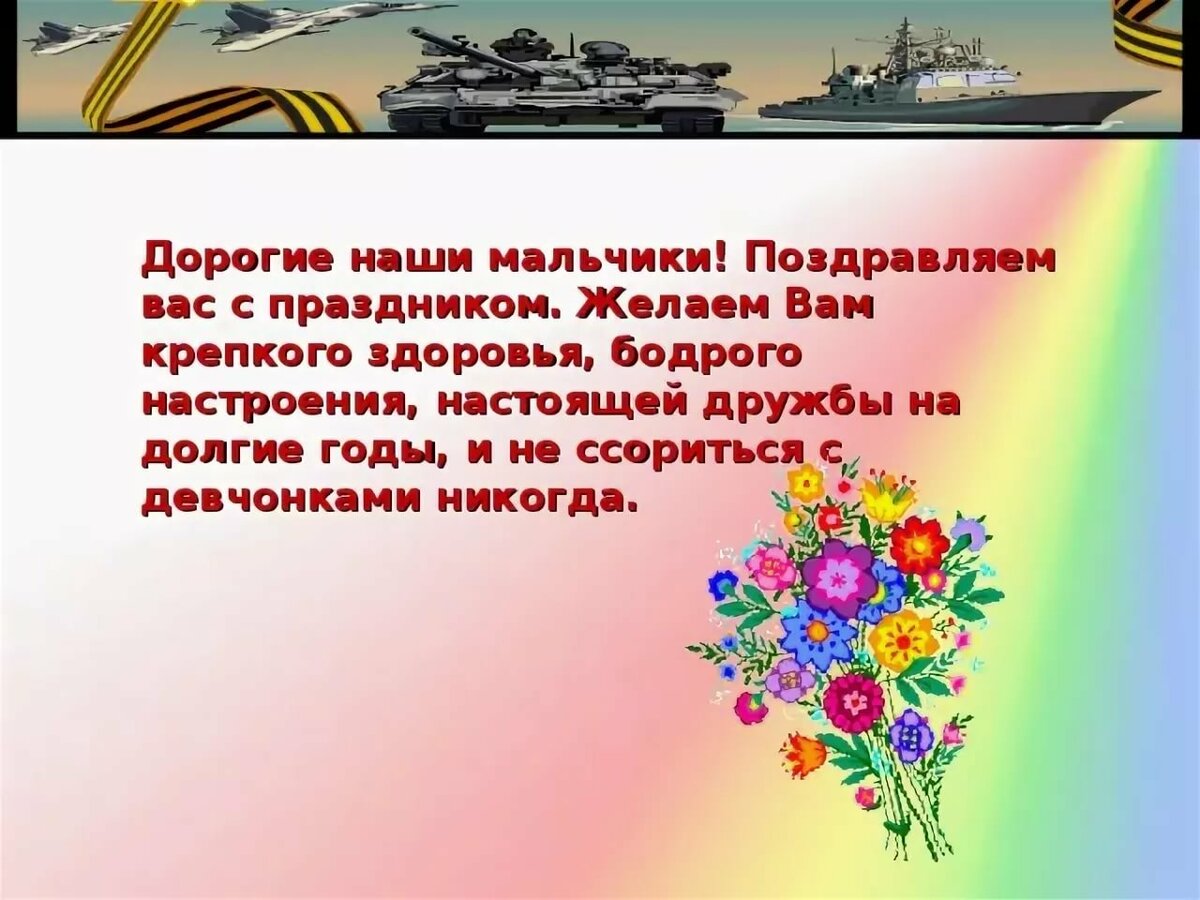 Пусть ваша дорога будет светла. С этим праздником, мальчишки дорогие, поздравляем вас всегда мы в феврале.