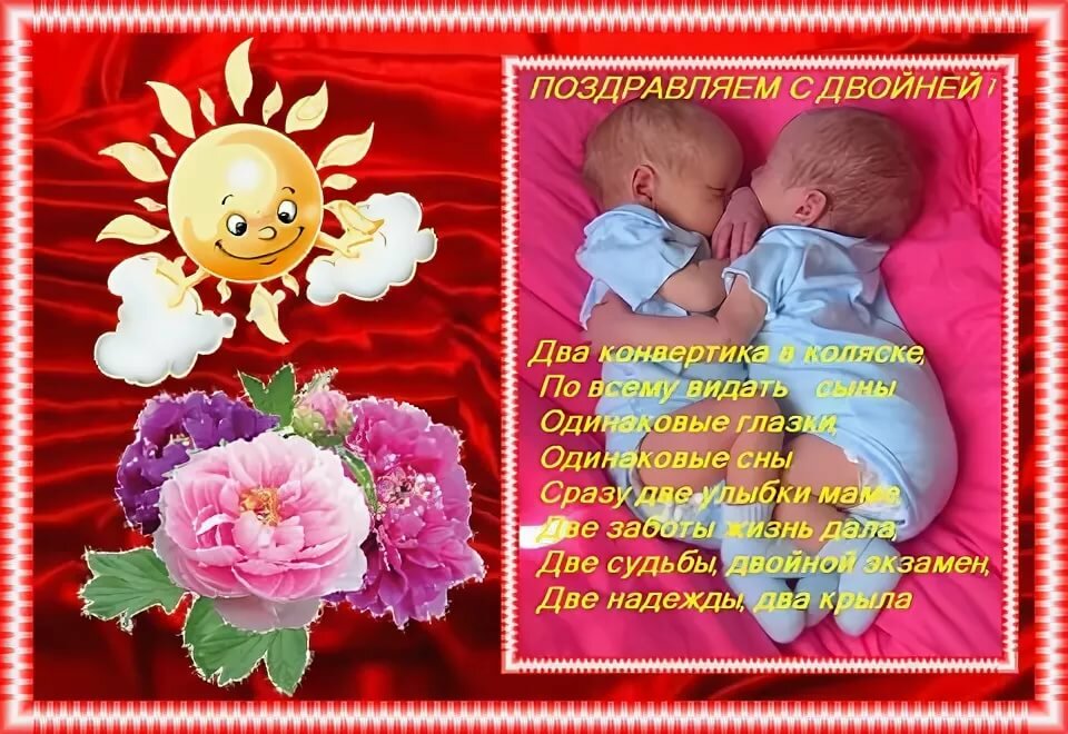 С этим дважды важным днем мы вас поздравляем, и здоровеньким расти малышам желаем, будет много радости и полно забот, пусть двойное счастье с ними к вам придет.