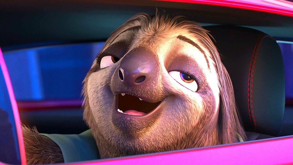 Ленивец работает в отделе и известен тем, что он самый быстрый работник из всех. Джуди показывает значок, ник улыбается. Ленивец из зверополиса улыбается.