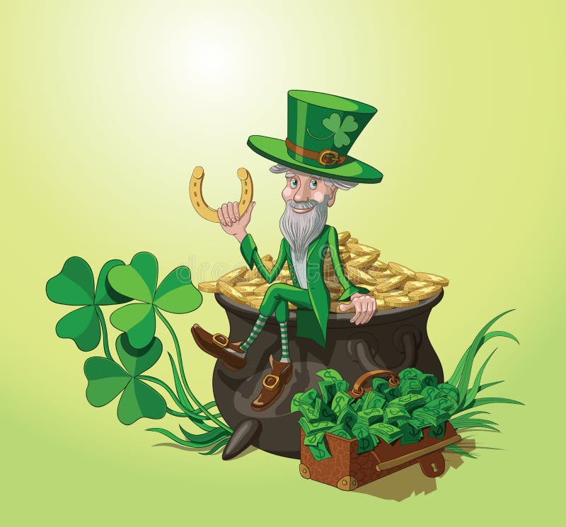 Лепрекон держит горшок с золотом.