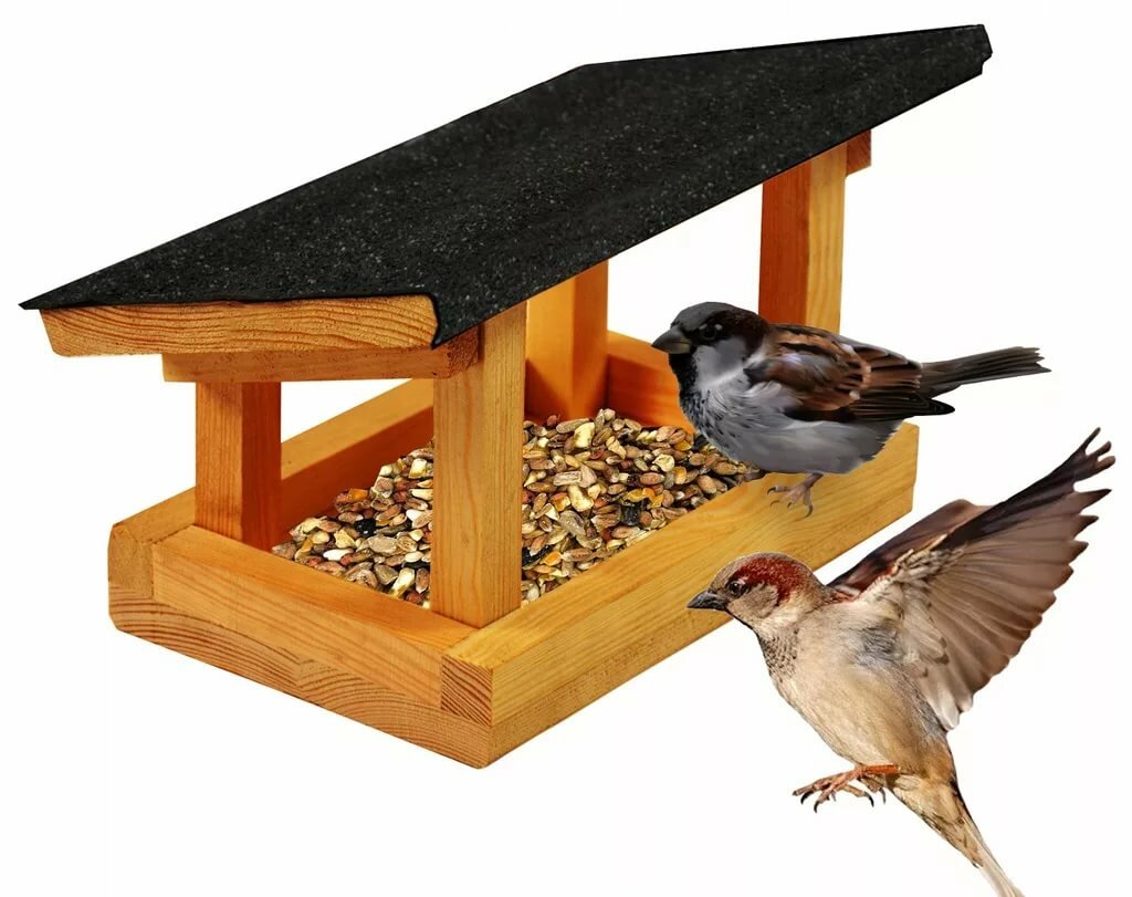 Кормушка для птиц, полная корма.