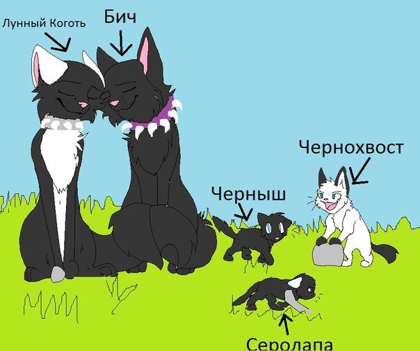 Бич и лунный коготь коты воители. В лесу спокойно живут четыре племени диких котов. Коты-воители синяя звезда и жёлудь. У него тёмно-серая грудка, живот и круги вокруг глаз.