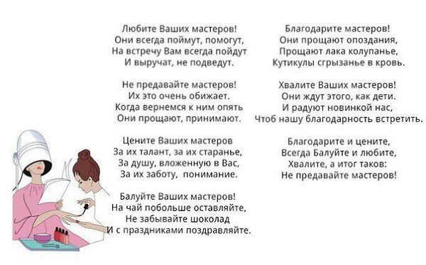 Пусть клиенток будет море, стороной обходит горе, с каждым днем доход растет, и успех в работе ждет. И поэма ногтепилка острым пушером задела.
