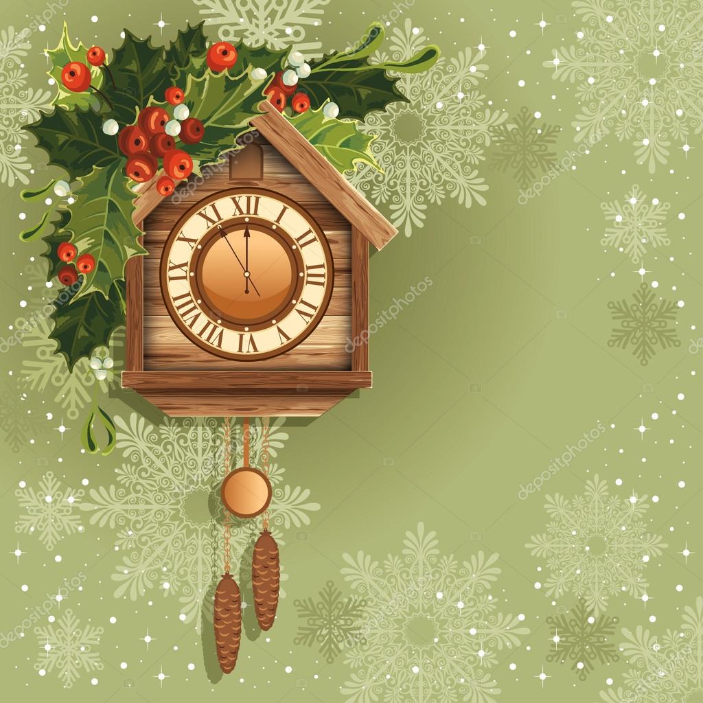 Если же нет таких, то их легко можно нарисовать. Новогодняя открытка - часы с кукушкой и елочные шары.