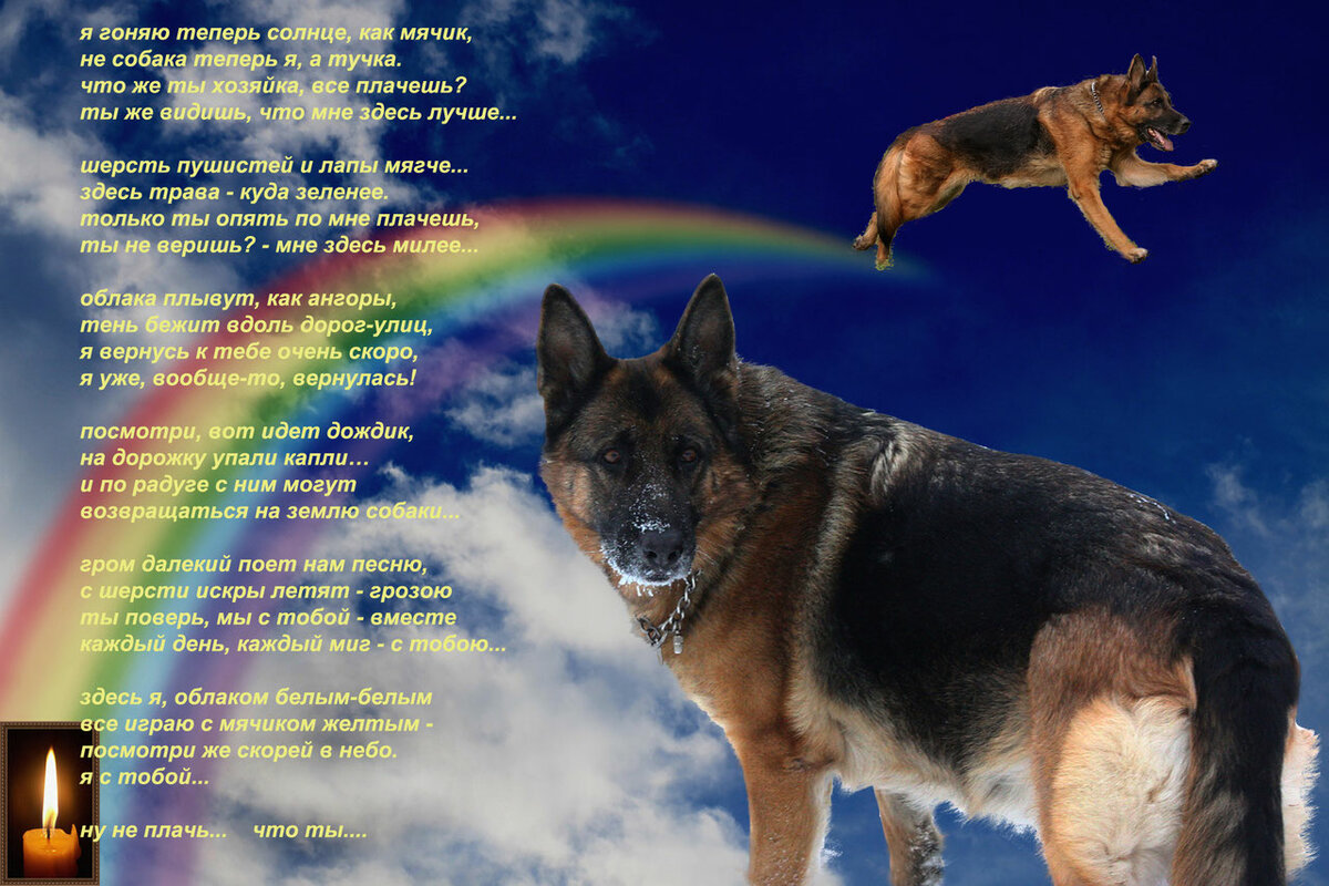 Марина, верьте, на небесах существует светлое место, где души наших ушедших собак находят мир и покой.
