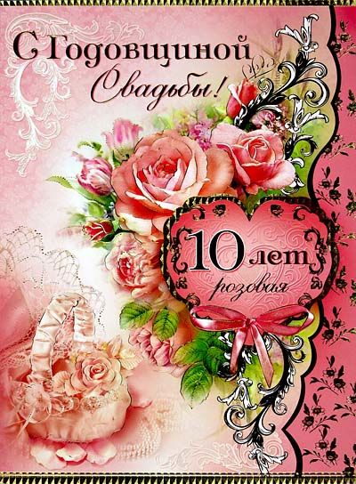 В день свадьбы розовой мы поздравляем вас. Десяток лет и в радости, и в горе корабль вашей любви плывет по морю. Так пусть же вся ваша семейная жизнь будет такой же прекрасной как розовый сад, но вот шипов в ней пусть будет поменьше. Пусть вас небо бережет, от горя и ненастья стережет.