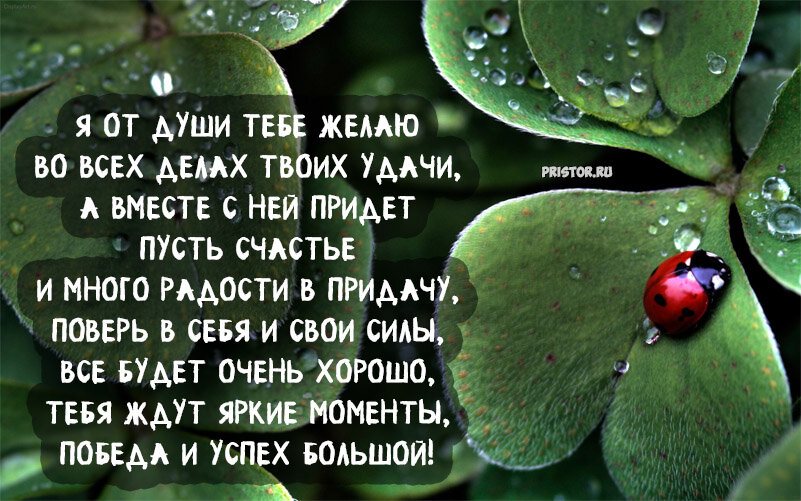 Вдохновения, удачи день за днём и успехов пожелать хотим во всём, процветания и счастья в настоящем, а на будущее перспектив блестящих. Желаю подружить с удачей и с ней об руку идти, легко, смеясь решать задачи и встретить счастье на пути.