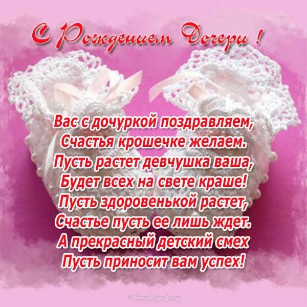 Примите в поздравленье эти строчки, желаю больше смеха, меньше слез. Искренне желаю блага и добра вашей семье, пусть крошка растёт большой радостью для родителей и станет настоящей гордостью и большой любовью папы.