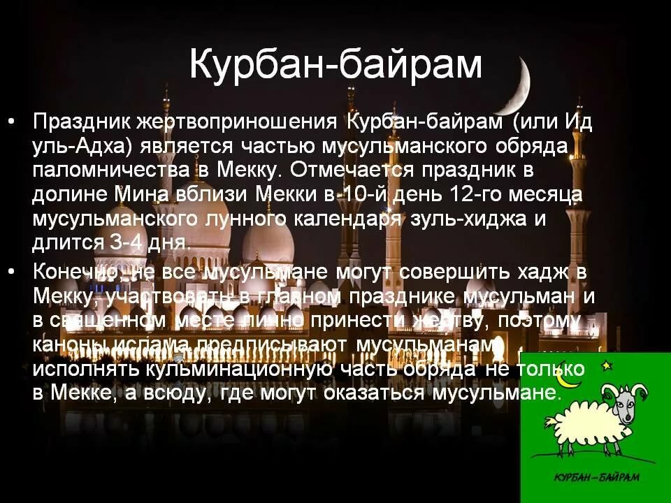 С тех пор курбан-байрам отмечают принесением в жертву овец, верблюдов или быков, отдавая часть на пожертвования. И за свои проступки в жизни к нему с молитвой обратись. Праздник является символическим и ритуальным жертвоприношением аллаху в знак истинной веры в него.