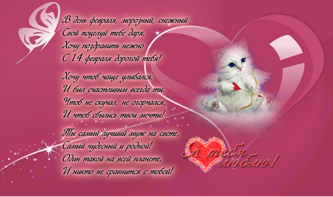 Пусть в этот день февральский, в твоей душе будет тепло, шлю поцелуй тебе я страстный, а после поведу тебя в кино.
