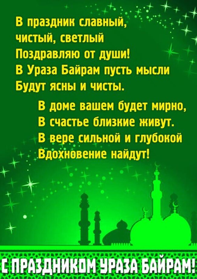 В вере сильной и глубокой вдохновение найдут. Живите в мире и достатке, здоровье будет пусть в порядке. Ранним утром верующие отправляются на праздничный намаз, после которого наступает пора веселья многие ходят в гости или принимают у себя родственников, друзей, соседей. Ураза, это исламский праздник, каждый год он начинается с окончания поста и только в месяц рамадан.