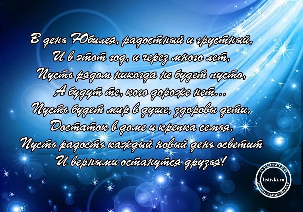 И в будущем радуй близких людей, пусть реальными станут миллионы идей. И пускай в суете наших дней скоротечных юбилей дарит радость и теплые встречи.