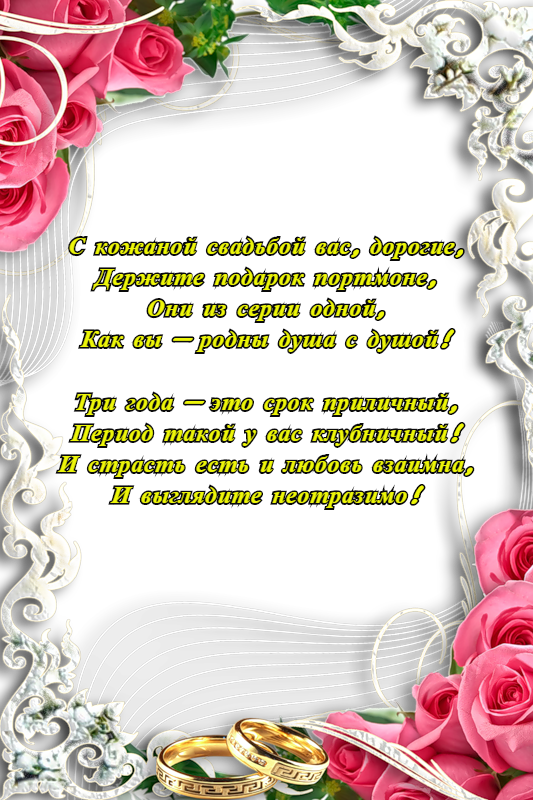 Живём, любимый, в мире и согласье, и понимаем друг без друга нам никак нельзя. С кожаной свадьбой тебя поздравляю, мы уже вместе три года с тобой я с полувзгляда тебя понимаю, знаю одно ты мне послан судьбой.