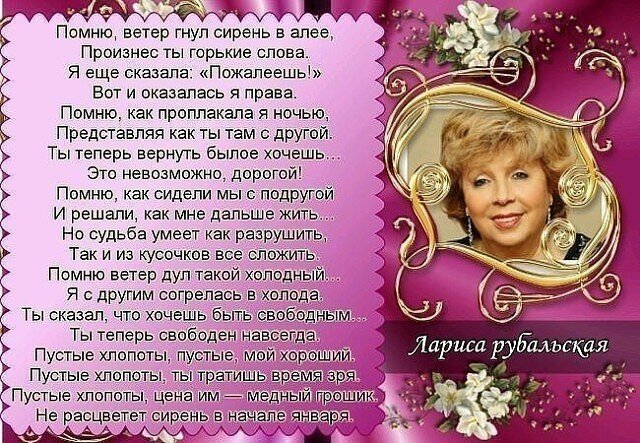 Праздничный день - день рождения родных и знакомых. А быть могло совсем не так встречаешь меня заплаканным взглядом. В стихах поздравляю сегодня тебя. У неё легкое перо, стихи просты и мелодичны, поэтому композиторы так любят с ней работать.