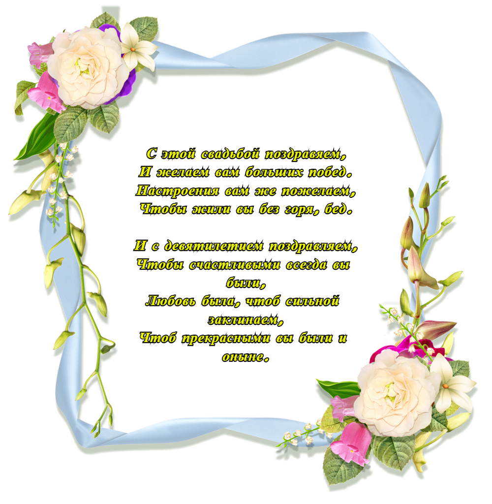 Вы девять лет прожили в браке, в нежности, доверии, любви. Живите дружной и богатой любовью, счастьем и семьей, и так - до свадьбы золотой.