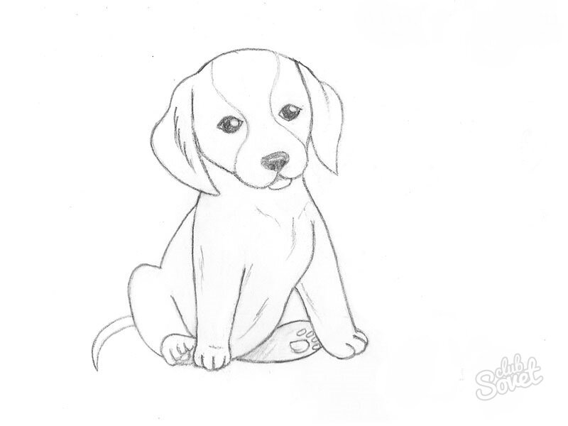 Простой щенок рисуется карандашом. Соедините левую с ухом маленькой чёрточкой.