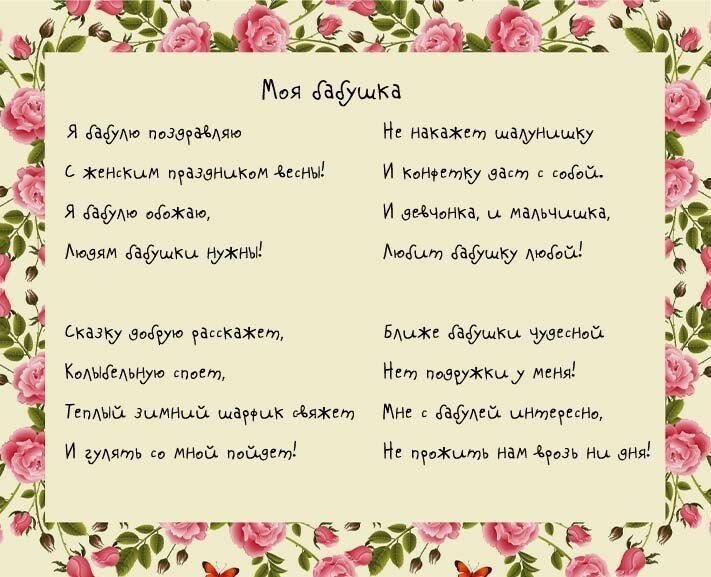 С ней печем оладушки, учим с ней стихи. Вы обязательно найдете подходящее стихотворение для вашей бабушки.