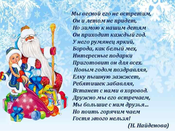 Всех он любит, всем всё дарит, лишь ему подарка нет. Для малышей подойдут совсем короткие, простые и понятные стихи про снегурочку.