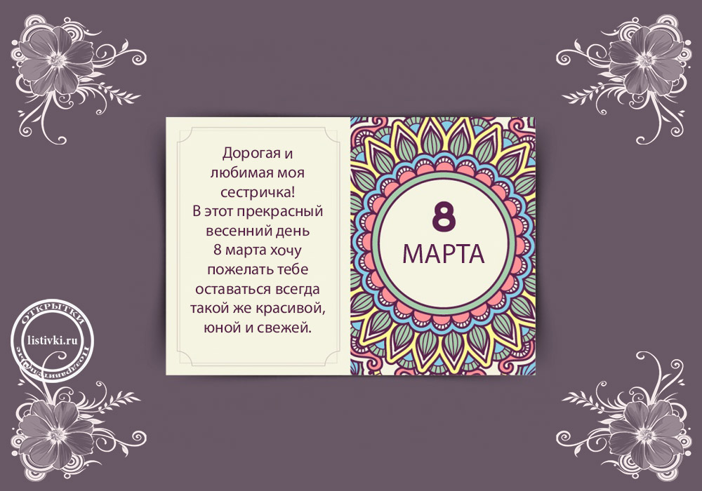 Прими же в подарок мои поздравленья с днем женским, с хорошей погодой тебя. Моя милая сестричка, поздравляю.