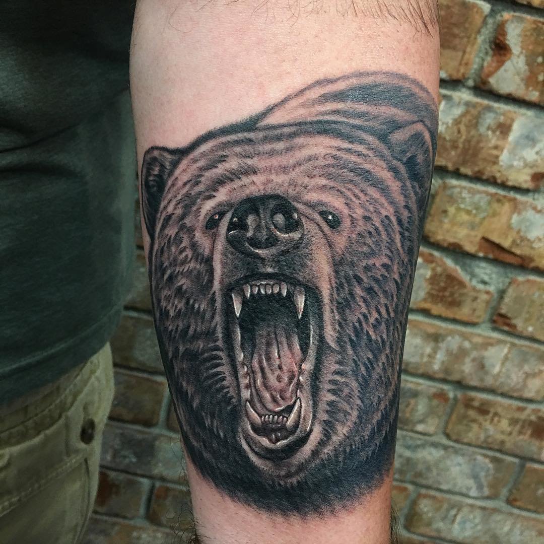 Тату очень популярно среди мужчин и женщин. Смысл медвежьей лапы, морды, оскала.
