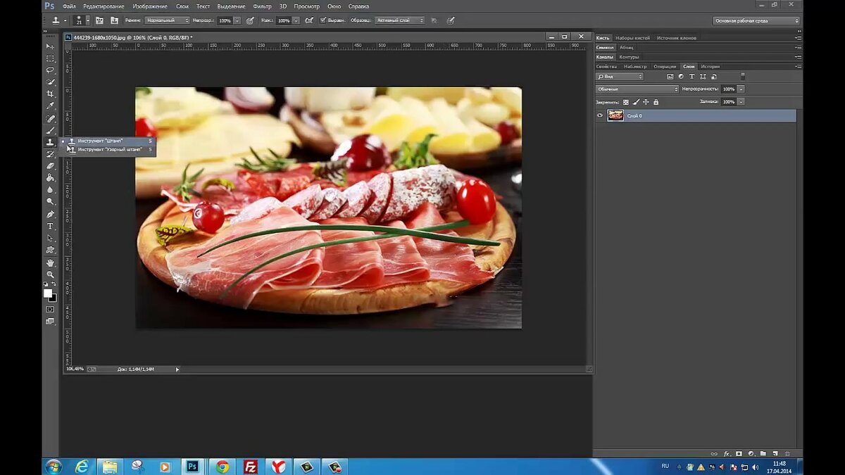 Удаление текста с помощью инструмента штамп. Как в фотошопе убрать надпись с картинки.